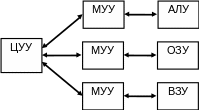 МУУ – местное УУ (находится при каждом из устройств, входящих в состав ЭВМ). Оно реализует специфические алгоритмы, соответствующие принципам действия различных внешних устройств.