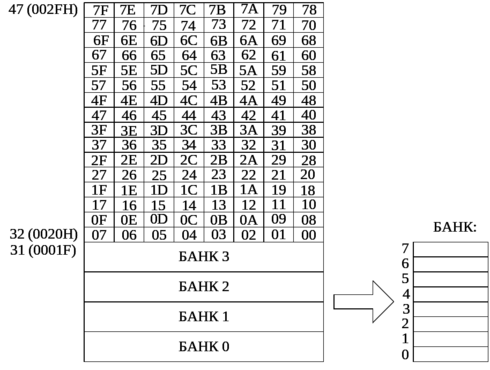 Первые 32 ячейки организованы в четыре банка рабочих регистров, обозначаемых соответственно RB0-RB3. Каждый из них состоит из восьми регистров R0 - R7. В любой момент доступен только один банк, номер которого зафиксирован в третьем и четвертом битах регистра слова состояния программы PSW и может быть программно изменён. По умолчанию включён нулевой банк рабочих регистров RB0.