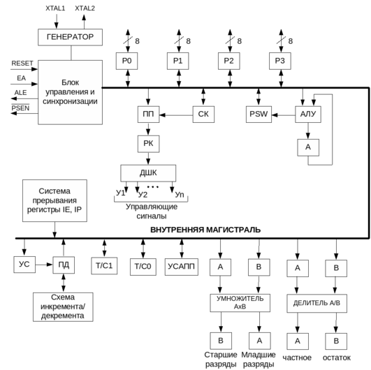 8) тактовый генератор, частота которого определяется внешним кварцевым резонатором. Частота тактового генератора базовой модели -12МГц, длительность машинного цикла 1мкс.