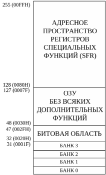 По адресам c 0030h (48-ая ячейка) по 0007F (127 ячейка) располагается область ОЗУ без всяких дополнительных функций.