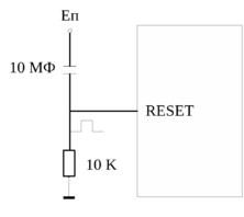 В контроллерах семейства 8051 первой выполняется команда, код которой расположен в самой первой ячейке памяти программ с адресом 0. Для этого необходимо обнулить счётчик команд, что достигается автоматическим формированием положительным импульс на входе RESET с помощью специальной RC-цепочки (рис. 2.8).