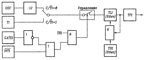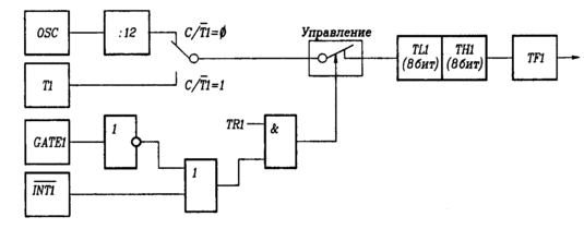 На рис.2.9 источник тактовой частоты обозначен OSC. На выходе OSC — частота Fт. Бит С/Т регистра TMOD определяет работу Т/С или в качестве таймера (С/Т=0), или в качестве счетчика (С/Т=1). Счет начинается при установке бита TR регистра TCON в состояние "1". При необходимости управления счетом извне бит GATE регистра TMOD устанавливается в состояние "1". Тогда при TR=1 счет будет разрешен, если на входе INT0 (для Т/С0) или INT1 (для Т/С1) установление состояние "1" и будет запрещен, если установлено состояние "0". Установка бита TR0 для Т/С0 и TR1 для Т/С1 в состояние "0" выключает Т/С независимо от состояния других битов.