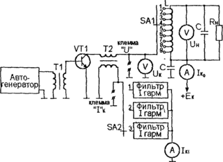Напряжение ВЧ сигнала через трансформатор Т1 поступает на транзистор VT1, который работает при нулевом напряжении смещения. В коллекторной цепи включен параллельный колебательный контур, коэффициент включения которого можно изменять с помощью переключателя SA1. Параллельно контуру подключено сопротивление нагрузки RH. При изменении коэффициента включения изменяется сопротивление нагрузки, приведенное к коллектору транзистора RK. Клеммы UK и IК предназначены для снятия осциллограмм напряжения и тока коллектора соответственно. Через переключатель SA2 к коллекторной цепи подключены фильтры гармоник. Изменяя положение переключателя, можно измерить действующее значение первой, второй или третьей гармоник тока коллектора. На лицевую панель макета установлены приборы, позволяющие измерить постоянную составляющую тока коллектора Iк0, действующее значение ВЧ колебаний на коллекторе UK, действующее напряжение ВЧ колебаний на нагрузке Uн, величину первой, второй и третьей гармоник тока коллектора IKi. Питание макета осуществляется от сети переменного тока напряжением 220В.