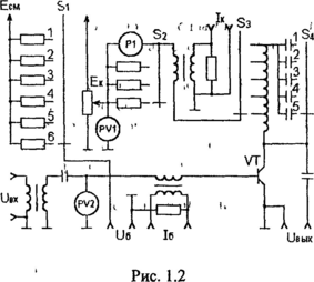 Принципиальная схема макета представлена на рис. 1.2. В коллекторную цепь включен колебательный контур, резонансная частота которого меняется переключателем S4. Переключателем S3 изменяется коэффициент включения колебательного контура в коллекторную цепь, а переключателем S1 - величина напряжения смещения Есм. На передней панели лабораторной установки расположены приборы измерения: напряжения питания Ек (PV1), постоянной составляющей коллекторного тока Iк0 (Р1); ручка регулировки напряжения питания Ек, переключатель S2 для изменения шкалы прибора Iк0. Клеммы "IК", "Iб" предназначены для подключения осциллографа, а клемма "Uвых" для подключения осциллографа или лампового вольтметра. Питание усилителя мощности осуществляется от выпрямителя, расположенного в лабораторной установке.