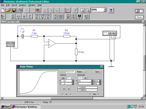 Согласно (5) схема, приведенная на рис.3, есть фильтр верхних частот. При параметрах элементов, приведенных на рис.3, постоянная времени фильтра Т= 1кОм*1мкФ=103*10 ─6=0,001с и, следовательно, частота среза , при которой ωТ=1: fср=1/2πT=159 Гц .