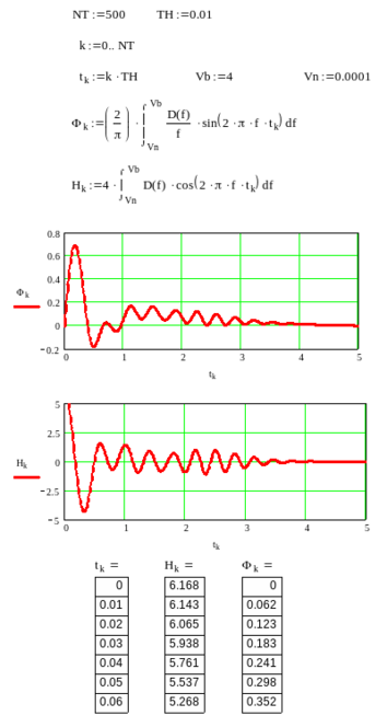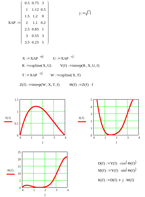 Сначала в программе заполняется матрица исходных данных согласно табл.3.1. Затем с помощью функций cspline и interp производятся интерполяция исходных зависимостей, представленных в табличной форме, и строятся графики амплитудно-частотной Y(f) и фазо-частотной Θ(f) характеристик цепи, а также зависимость группового времени запаздывания от частоты Z(f) . Далее согласно (5) и (6) рассчитываются и строятся временные характеристики цепи - переходная Ф(t) и импульсная Н(t).