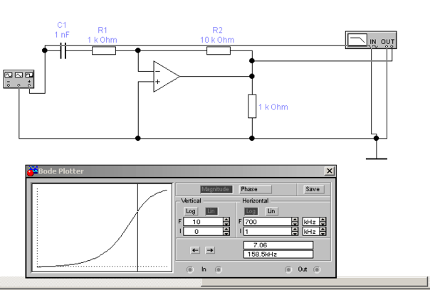Согласно (5) схема, приведенная на рис.3, есть фильтр верхних частот. При параметрах элементов, приведенных на рис.3, постоянная времени фильтра