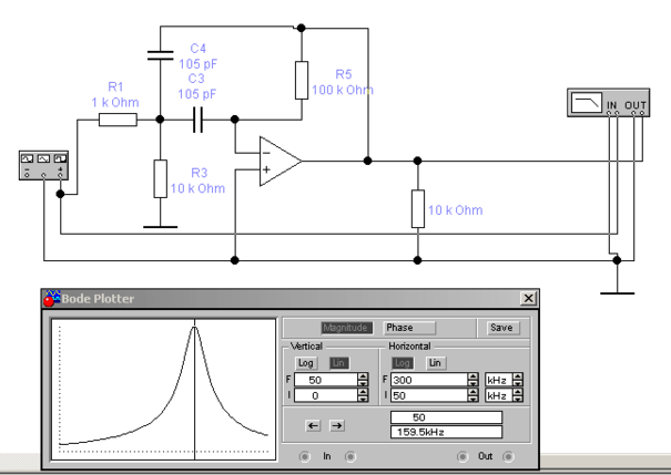 Амплитудно-частотная характеристика полосового фильтра, полученная с помощью приборов, приведенных на схеме рис.4, построена на том же рисунке. При параметрах элементов, приведенных на рис.4, центральная частота полосового фильтра равна 159 кГц.