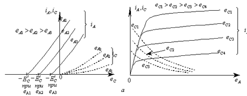 На рис.1.3 показаны без привязки к конкретному прибору статические ВАХ электронной лампы при включении по схеме с общим катодом и статические ВАХ биполярного транзистора при включении его по схеме с общим эмиттером. Подобные ВАХ мы найдём в справочниках по генераторным лампам и транзисторам. Отметим, что на приведенных характеристиках