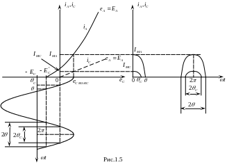 < θ. Углом нижней отсечки тока электрода АЭ в ГВВ принято называть половину той доли периода сигнала возбуждения, выраженную в градусах или радианах, в течение которой через электрод протекает ток. Слово «нижний» в определении угла отсечки тока электрода, как видно из рис.1.5, отражает факт отсечки импульсов тока снизу.