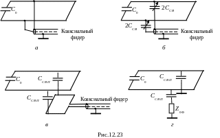 . Реализация настройки ёмкости связи при использовании контура из короткозамкнутого отрезка коаксиальной линии и эквивалентные схемы получающихся цепей показаны на рис.12.20. Аналогично может быть реализована настройка ёмкостной связи в случае контуров из разомкнутых отрезков линий.