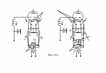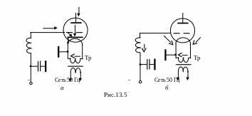 В схеме (рис.13.6,а) заземлена средняя точка у вторичной обмотки трансформатора накала, а в схеме (рис.13.6,б) создана «искусственная» средняя точка с помощью потенциометра R. В этих схемах потенциал сетки по отношению к левой и правой половинам нити накала (катода) изменяется на одну и ту же величину, но с разным знаком: