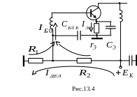 маломощных транзисторных генераторах важным является вопрос температурной стабилизации рабочей точки. Для этих целей часто используется схема рис.13.4. Температурная стабилизация осуществляется за счёт сопротивления в эмиттере
