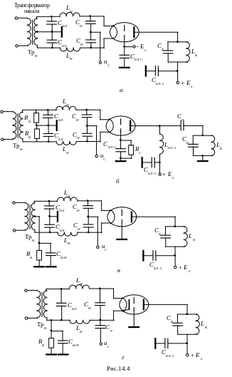Через этот конденсатор осуществляется отрицательная обратная связь по напряжению между входной и выходной цепями генератора. Чем больше ёмкость блокировочного конденсатора, тем меньше обратная связь. Однако иметь блокировочный конденсатор большой ёмкости в цепи сетки часто не представляется возможным, так как этот конденсатор выполняется обычно конструктивно. Если невозможно реализовать конденсатор СБЛ С необходимой ёмкости, то следует сетку соединять непосредственно с землёю (корпусом) генератора и использовать катодное автосмещение, как в схемах (рис.14.4,в,г).