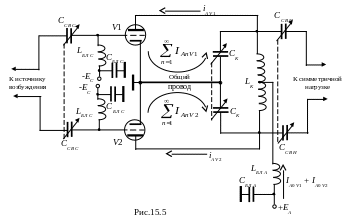 а рис.15.5 показана схема ГВВ с двухтактным включением двух ламп V1, V2 с общим катодом. Нагрузкой ламп является параллельный колебательный контур, образованный двумя ёмкостями СК и индуктивностью LK. Очевидно, результирующая ёмкость контура равна СК /2.