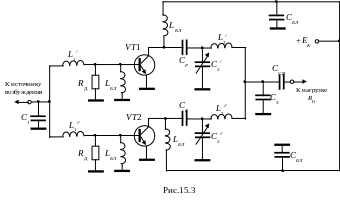 LC-элементов во входных и выходных цепях. Подобная схема с параллельным включением двух биполярных транзисторов VT1, VT2 с общим эмиттером показана на рис.15.3.