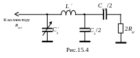 При расчёте цепи согласования (ЦС) с полезной нагрузкой генератора RН в схеме рис.15.3 следует исходить из схемы ЦС для каждого транзистора, представленной на рис.15.4, где Roe1- требуемое сопротивление нагрузки в коллекторной цепи одного транзистора (находится при расчёте режима). Сопротивления ёмкостей С3, ССВ и нагрузки RН в схеме (рис.15.4) удваиваются за счёт совместной работы двух транзисторов (в общем случае сопротивления этих элементов увеличиваются в N раз).