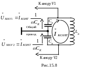 протекает в противоположных направлениях относительно средней точки ёмкостной ветви контура, создавая противофазные напряжения на ёмкостях СК (рис.15.8), что отражено в записи (15.7). Поэтому двухтактный генератор по схеме (рис.15.5) удобен для подключения симметричной нагрузки. В частности, к контуру двухтактного генератора непосредственно может быть подключена симметричная двухпроводная линия (двухпроводный фидер).