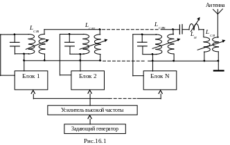 Возможная реализация метода сложения мощностей блоков в общем контуре показана на рис.16.1. Выходной каскад передатчика выполняется в виде нескольких идентичных блоков, связанных с общим контуром нагрузки. Блоки включены параллельно. Возможно последовательное включение блоков. Результирующая мощность в нагрузке равна сумме мощностей складываемых блоков. Независимо от способа включения блоков работа их оказывается взаимозависимой, так как все они связываются между собою через общий контур нагрузки. Выход из строя одного блока сказывается на работе оставшихся, что требует соответствующей регулировки связи блоков с контуром нагрузки. Вышедший из строя блок отключается и восстанавливается. Подобный принцип использовался при построении мощных и сверхмощных отечественных радиовещательных станций.
