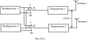 сли сложение высокочастотных полей в пространстве не требуется, то передатчики могут работать независимо друг от друга на разных частотах, с разными корреспондентами и передавать разные программы (переключатели П1 и П2 в положении III). При переходе в режим сложения оба передатчика настраиваются на одну частоту и возбуждаются от одного возбудителя (переключатели в положении I или II соответственно).