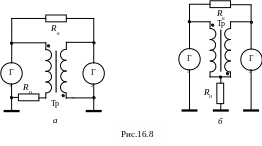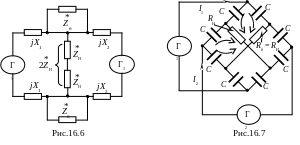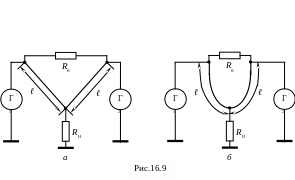 В мостах по схемам (рис.16.9 и рис.16.10) генераторы должны быть синфазными и полностью идентичными. Если напряжения генераторов окажутся в противофазе, то мощность будет выделяться в балластном резисторе Rб, а в нагрузке RН ток будет отсутствовать.