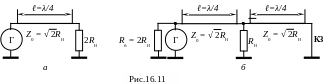Действительно, если оба генератора одинаковы, то можно считать, что каждый из них соединяется через отрезок линии длиной λ/4 с сопротивлением 2RН. Сопротивление нагрузки RН удваивается, так как результирующий ток через это сопротивление в два раза больше тока через него одного генератора. Следовательно, ощущаемое сопротивление одним генератором возрастает в два раза. На рис.16.11,а представлена эквивалентная схема рассматриваемого моста для каждого из генераторов в номинальном режиме моста, то есть при совместной работе двух идентичных генераторов. Входное сопротивление четвертьволнового отрезка линии с волновым сопротивлением Z0, нагруженного на сопротивление 2RН, как известно, равно: