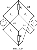 ля суммирования мощностей двух симметричных (двухтактных) генераторов можно применить мост на отрезках двухпроводной линии, показанный на рис.16.14. Все отрезки имеют одинаковую длину ℓ = λ/4 на средней частоте. Благодаря перекрещиванию проводов у одного из отрезков, соединяющих балластный резистор с одним из генераторов, обеспечивается развязка генераторов и токи, создаваемые ими в Rб, взаимно компенсируются. Отрезок длиной λ/4 с перекрещенными проводами заменяет отрезок длиной 3λ/4.