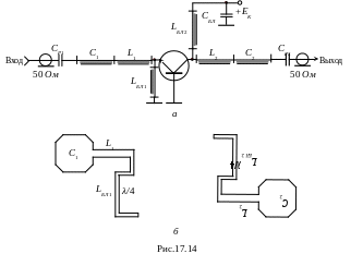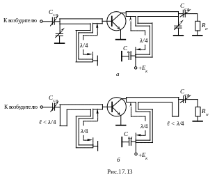 а рис.17.13 показаны принципиальные схемы – упрощенные конструкции однотактных транзисторных генераторов СВЧ с изготовлением элементов согласующих цепей из отрезков линий.