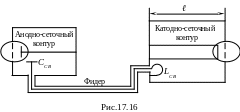 Фидер должен быть согласован со входным (катодно-сеточным) контуром, для чего необходимо, чтобы эквивалентное сопротивление входного контура, пересчитанное к концу фидера, было равно волновому сопротивлению фидера Z0Ф. Необходимая величина сопротивления связи ХСВ, реализуемая с помощью петли связи LСВ в примере рис.17.16, может быть найдена следующим образом.