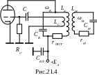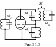 В двухконтурных АГ (рис.21.3) связь между контурами внешнеёмкостная. В схеме двухконтурного АГ (рис.21.4) связь между контурами трансформаторная (магнитная). Принципиально в подобном АГ, отвлекаясь от удобства её реализации, связь между контурами может быть любая: автотрансформаторная (внутри- и внешнеиндуктивная), ёмкостная (внутри- и внешнеёмкостная). Следует отметить, что, несмотря на некоторые общие черты, обусловленные наличием связи между контурами независимо от способа её осуществления, есть и некоторые отличия, обусловливаемые именно типом и видом связи, которые имеют принципиальное значение для правильного понимания работы двухконтурных АГ.
