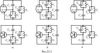В зависимости от того, какой электрод является общим для обоих контуров, принята следующая классификация схем двухконтурных АГ: схемы (рис.21.3,а) называются схемами двухконтурного АГ соответственно с общим катодом и с общим эмиттером; схемы (рис.21.3,б) – соответственно схемы двухконтурных АГ с общей сеткой и с общей базой; схемы (рис.21.3,в) – схемы двухконтурных АГ с общим анодом и с общим коллектором, соответственно. Одиночные ёмкости С3, С2, С1 в соответствующих схемах двухконтурных АГ (рис.21.3,а, б, в) называются ёмкостями связи. Часто общий для контуров электрод АЭ (лампы или транзистора) заземляется. Однако последнее необязательно.