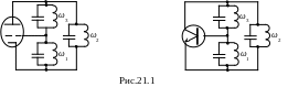 Как видим, колебательная система любого двухконтурного АГ по схеме рис.21.3 представляет систему двух параллельных колебательных контуров с внешней ёмкостной связью. В таких системах, как известно, при превышении связи между контурами некоторого уровня существуют две частоты собственных колебаний, в окрестности которых система проявляет свойства, характерные для параллельного колебательного контура.2 Эти частоты носят название частот связи, из которых большая называется верхней, а меньшая – нижней. Как ниже увидим, в представленных на рис.21.3 схемах двухконтурных АГ автоколебания возможны только на одной частоте связи, на которой коэффициент обратной связи оказывается положительным. Для второй частоты связи коэффициент обратной связи получается отрицательным и устойчивые автоколебания на ней невозможны.