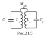 ассмотрим систему двух связанных контуров с трансформаторной связью (рис.21.5). Потерями в контурах пренебрегаем, что автоматически приводит к тому, что любой коэффициент связи между контурами превышает критическое значение и частоты связи существуют. Это также означает, что результирующее эквивалентное сопротивление со стороны любого контура имеет реактивный характер (нет потерь), а величина его может находиться в пределах от нуля до бесконечности. Результирующее сопротивление со стороны, например, первого контура L1, C1 в последовательном представлении определяется выражением:4