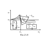 усть АЭ подключается со стороны первого контура. Тогда второй контур соответствует контуру внешней нагрузки. Отметим, что влияние контура нагрузки сказывается не только на частоте автоколебаний, но и на самовозбуждении АГ. Очевидно, чем сильнее реакция контура нагрузки, тем большее сопротивление вносится в первый контур и в итоге уменьшается эквивалентное сопротивление системы, являющееся нагрузкой АЭ (лампы в схеме рис.21.4). В частности, при пренебрежении потерями на собственной частоте второго контура (контура нагрузки) в первый контур вносится, как отмечалось, бесконечное сопротивление и индуктивная ветвь первого контура отрывается от ёмкостной ветви. В итоге в параллельном эквиваленте со стороны первого контура будет иметь место чисто ёмкостное сопротивление нагрузки, определяемое ёмкостью С1 на частоте ω2. Естественно, ни о каком самовозбуждении АГ на этой частоте не может идти речь. В общем случае при учёте потерь, в частности полезной нагрузки, уменьшение эквивалентного сопротивления нагрузки АЭ (лампы в схеме рис.21.4) может привести к тому, что при установленном в схеме коэффициенте обратной связи (см. лекцию 19)