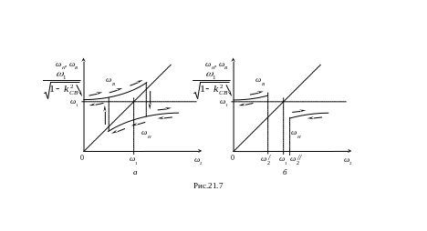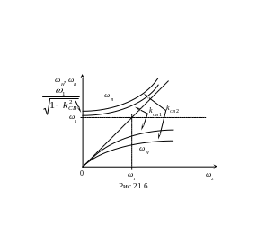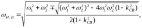 Графически зависимости ωН и ωВ для двух значений kСВ представлены на рис.21.6 (kСВ2 > kСВ1). Как следует из приведенных графиков, нижняя частота связи ωН всегда меньше собственных частот контуров ω1 и ω2, а верхняя частота связи ωВ всегда больше этих частот, причём, чем сильнее связь, тем заметнее частоты связи отличаются от собственных частот контуров.