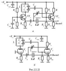 Двухкаскадная схема Батлера КАГ может быть реализована с нейтрализацией статической ёмкости КвР. В этом случае вместо повторителя используется каскад с разделённой нагрузкой. Примеры транзисторного и лампового вариантов такой схемы даны на рис.22.22.