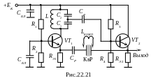 Двухкаскадная схема Батлера КАГ на транзисторах на основе ёмкостной трёхточки представлена на рис.22.21. Аналогично выполняется схема на основе индуктивной трёхточки, а также при использовании ламп.12