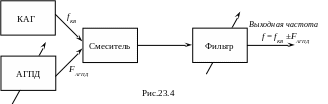 раз нестабильности частоты низкочастотного АГ. Это обстоятельство даёт возможность в качестве низкочастотного АГ использовать бескварцевый АГ плавного диапазона (АГПД). В этом случае мы получим плавное (сплошное) перекрытие требуемого диапазона частот от fМИН до fМАКС. Интерполяционная схема диапазонного возбудителя с АГПД представлена на рис.23.4.