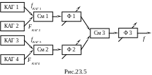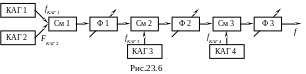 N = 2 (2n1)(2n2) =8n1n2 дискретных частот. По методу многократного гетеродинирования, применяя в каждом высокочастотном КАГ (КАГ 1 и КАГ 3) по n1 КвР, а в каждом низкочастотном КАГ (КАГ 2 и КАГ 4) по n2 КвР, мы получим N = 2 (2n1n2)(2n1n2) = 8n12n22 дискретных частот, то есть в n1n2 раз больше. Схема (рис.23.5) носит название параллельной схемы многократного гетеродинирования. Возможна реализация последовательной схемы, представленная на рис.23.6.