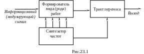 Возбудители современных радиопередатчиков являются сложными устройствами, основой которых являются так называемые синтезаторы частот. Синтезаторы частот позволяет перекрывать весь рабочий диапазон дискретно или плавно с привлечением ограниченного числа КвР. В состав возбудителей входят также формирователи рода (вида) работ. В формирователе рода (вида) работ осуществляется формирование модулированного сигнала, производимое обычно на пониженной частоте, с последующим переносом спектра в диапазон рабочих частот. Поэтому ещё одним элементом возбудителя является тракт переноса сформированного сигнала в рабочий диапазон частот. Структурная схема возбудителя современного радиопередатчика представлена на рис.23.1. Весь комплекс возбудителя снабжается собственными источниками питания и конструктивно выполняется в виде отдельного автономного блока или стойки. Очевидно, при отсутствии формирователя вида (рода) работ и тракта переноса возбудитель – он же синтезатор частот.