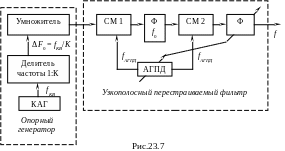 омпенсационная схема, известная также как схема с вычитанием ошибки, обеспечивает более эффективное подавление комбинационных частот. Сущность схемы заключается в создании достаточно узкополосного перестраиваемого фильтра в диапазоне рабочих частот возбудителя, который и обеспечивает подавление комбинационных частот. Упрощенная структурная схема возбудителя по компенсационной схема представлена на рис.23.7.