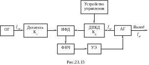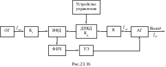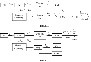 В схеме (рис.23.16) частота fАГ предварительно понижается с помощью делителя частоты с постоянным коэффициентом деления К до значения рабочей частоты ДПКД. Далее всё как в схеме рис.23.15. Соответственно частота выходных колебаний оказывается равной