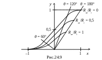 Нетрудно видеть, что значения параметра y заключены в пределах 0…1. Нулевое значение имеет место при θ = 0 и не зависит от отношения Roe/Ri. Максимальное значение y = 1 имеет место при θ = 180°, причём только при Roe/Ri = 0. При значениях Roe/Ri, отличных от нуля, максимальное значение y при θ = 180° оказывается меньше единицы. Значения параметра x заключены в пределах –1…+1. При этом значение –1 соответствует θ = 0 и не зависит от отношения Roe/Ri. Значение +1 имеет место при θ = 180°, причём только при Roe/Ri = 0. При значениях Roe/Ri, отличных от нуля, максимальное значение x при θ = 180° оказывается меньше +1.