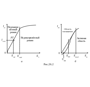 Таким образом, при анодной модуляции лампа в отдельные моменты времени отдаёт мощность больше номинальной (паспортной). При этом в максимальном режиме при 100% модуляции отдаваемая лампой мощность превышает её номинальную мощность в 2 раза. Такой результат объясняется тем, что при анодной модуляции лампа полностью используется по току в максимальном режиме при напряжении на аноде в 2 раза больше номинального. На рис.26.3 показаны ДХ анодного тока лампы при использовании её в ГВВ без модуляции в оптимальном режиме и для максимального режима при использовании этой лампы в генераторе с анодной модуляцией. Как видно из ДХ, при анодной модуляции лампа переиспользуется по напряжению в 2 раза.
