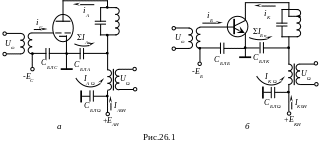 Возможные схемы генераторов с анодной и коллекторной АМ представлены на рис.26.1,а,б соответственно. В представленных схемах использовано последовательное питание анода (коллектора), что более наглядно, но непринципиально для рассмотрения сути и основных положений данного вида АМ.