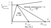 При анодной модуляции в перенапряжённом режиме в силу линейной зависимости IA1(ЕА) (рис.26.2,а) уравнение СМХ описывается уравнением прямой линии, проходящей через начало координат, то есть справедливо считать