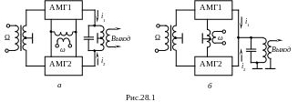 В схеме (рис.28.1,а) модулирующий сигнал подаётся на генераторы в противофазе, как в двухтактной схеме, а высокочастотный (модулируемый) сигнал в фазе. Выходы генераторов подключены к нагрузке последовательно, как в двухтактной схеме. В схеме (рис.28.1,б) модулирующий и модулируемый сигналы подаются на генераторы в противофазе, как в двухтактной схеме, а выходы генераторов подключаются к нагрузке параллельно.6 На выходе каждого из генераторов получаем амплитудно-модулированный ток.