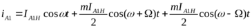 Спектр колебания, модулированного по амплитуде одним тоном с частотой Ω, состоит из трёх гармонических составляющих: несущего колебания с частотой ω и колебаний боковых частот – верхней (ω + Ω) и нижней (ω – Ω). Выражение, например, амплитудно-модулированного анодного тока имеет вид:1