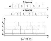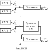 формировать сигнал ЧТ можно переключением частот двух независимых КАГ, как показано, например, на схеме рис.29.23,а. Однако при этом могут иметь место скачки фазы до 1800 в моменты коммутации (переключения генераторов), что приведёт к расширению спектра получаемого сигнала и соответственно к возрастанию внеполосных составляющих. Этот недостаток можно устранить, применив деление частоты получаемого сигнала ЧТ в N раз (рис.29.23,б). При достаточно большом значении N ≈ 100…150 скачки фазы соответственно уменьшаются до ≈ 1,2…1,80, но одновременно понижается и основная частота выходного колебания. Внеполосные составляющие спектра получаемого сигнала дополнительно ослабляются избирательными цепями последующих усилительных каскадов. Аналогично можно осуществить коммутацию четырёх КАГ при ДЧТ. В качестве переключателей используют электронные ключи, управляемые сигналами от манипулятора или подобного устройства, формирующего первичные телеграфные сигналы в виде посылок и пауз, единиц (1) и нулей (0) (рис.29.22).