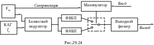 качки фазы при формировании сигнала ЧТ можно устранить, применив схему рис.29.24, в которой частоты нажатия f1 и пауз f2 образуются как боковые составляющие спектра АМ сигнала при модуляции колебания несущей частоты f0 сигналом с частотой FМ = Δf / 2, причём моменты переключения частот синхронизируются с частотой FМ, так что коммутация происходит в моменты прохождения модулирующего сигнала через нулевое значение (нулевой уровень). Сигнал несущей частоты подавляется в балансном модуляторе, на выходе которого существуют колебания верхней боковой полосы (ВБП)